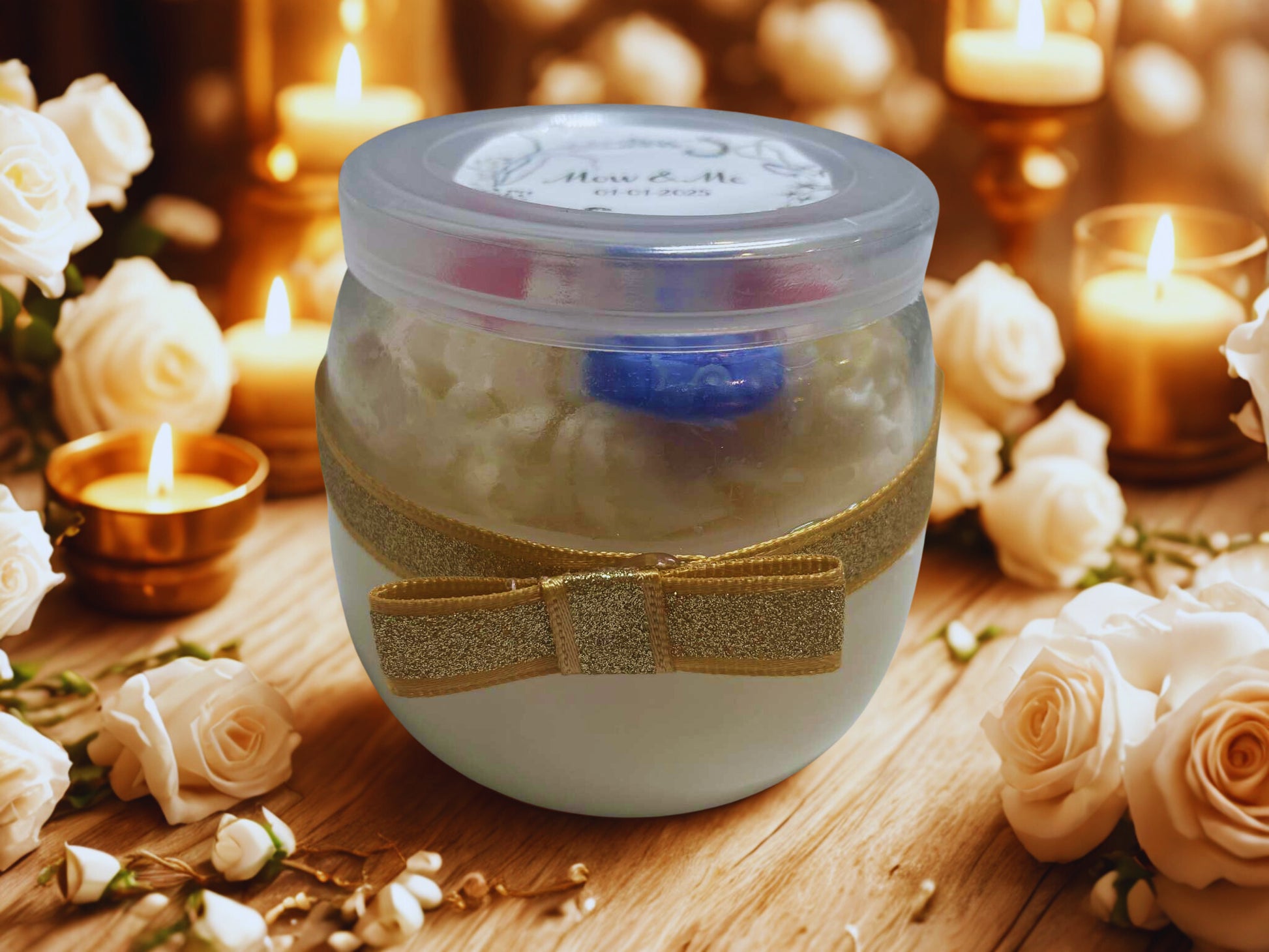 Elegant and charming, this 5oz jar candle is adorned with a shimmering gold ribbon and topped with intricate wax decorations in the shape of flowers, berries, and hearts. Each jar is personalized with a wedding label, making it the perfect keepsake for guests to remember your special day. Ideal as a table decoration or a heartfelt thank-you gift, it adds both beauty and warmth to any celebration.
